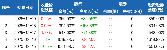 融資方面,當(dāng)日融資買入77.89萬元,融資償還113.44萬元,融資凈償還35.55萬元,連續(xù)3日凈償還累計260.79萬元。融券方面,融券賣出0份,融券償還0份,融券余量0份,融券余額0元。融資融券余額合計1359.09萬元。