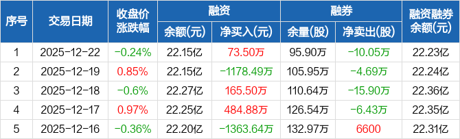 國(guó)元證券融資融券信息顯示,2025年12月22日融資凈買(mǎi)入73.5萬(wàn)元;融資余額22.15億元,較前一日增加0.03%。