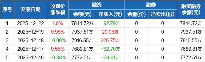 融資方面,當(dāng)日融資買入352.37萬元,融資償還445.15萬元,融資凈償還92.79萬元。融券方面,融券賣出0份,融券償還0份,融券余量0份,融券余額0元。融資融券余額合計7844.72萬元。