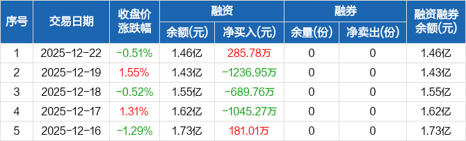 融資方面,當日融資買入1167.59萬元,融資償還881.81萬元,融資凈買入285.78萬元。融券方面,融券賣出0份,融券償還0份,融券余量0份,融券余額0元。融資融券余額合計1.46億元。