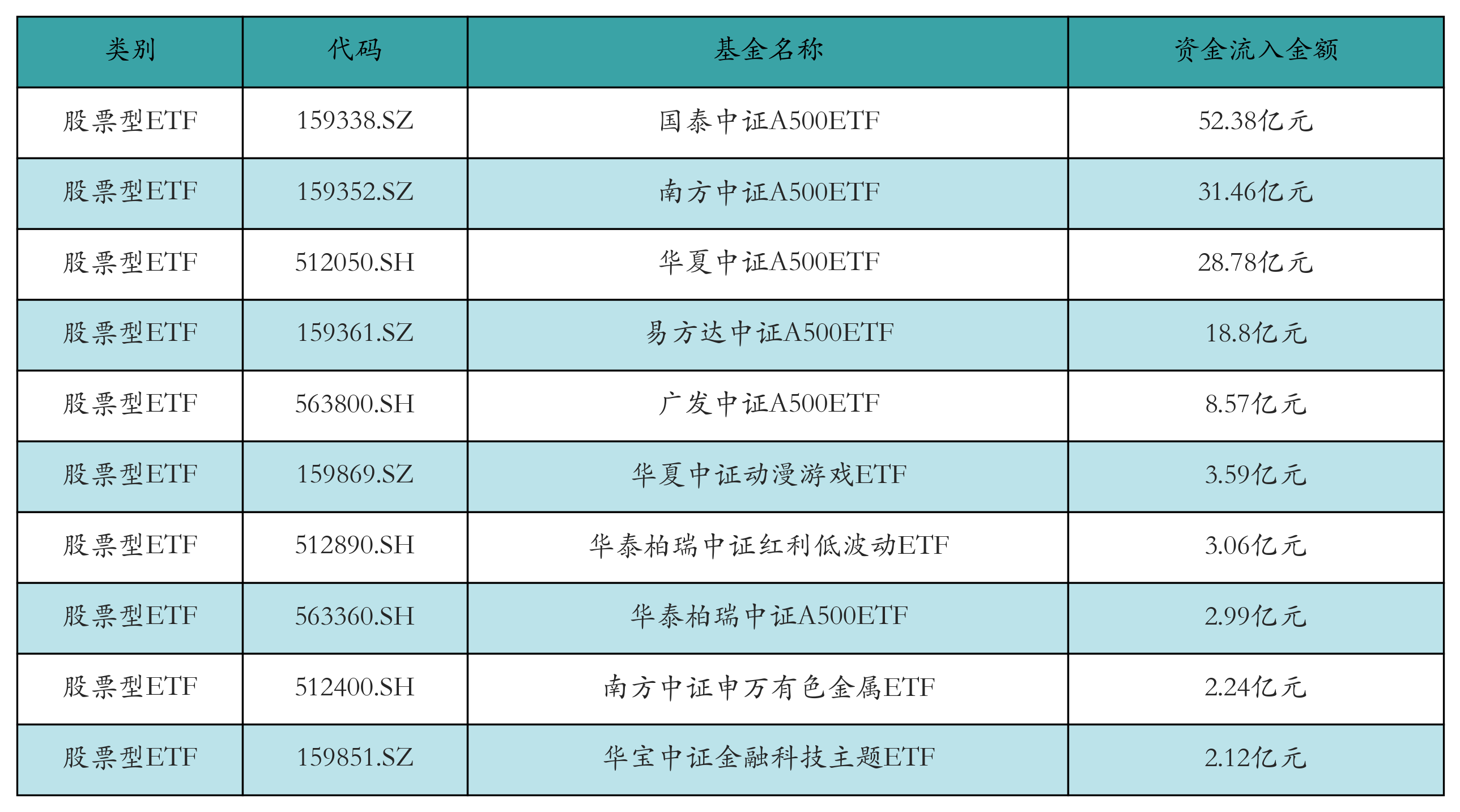 昨日股票型ETF資金流入最多的3只ETF及其流入金額分別為:國(guó)泰中證A500ETF(流入52.38億元)、南方中證A500ETF(流入31.46億元)、華夏中證A500ETF(流入28.78億元)。資金流入前10詳情見(jiàn)下表: