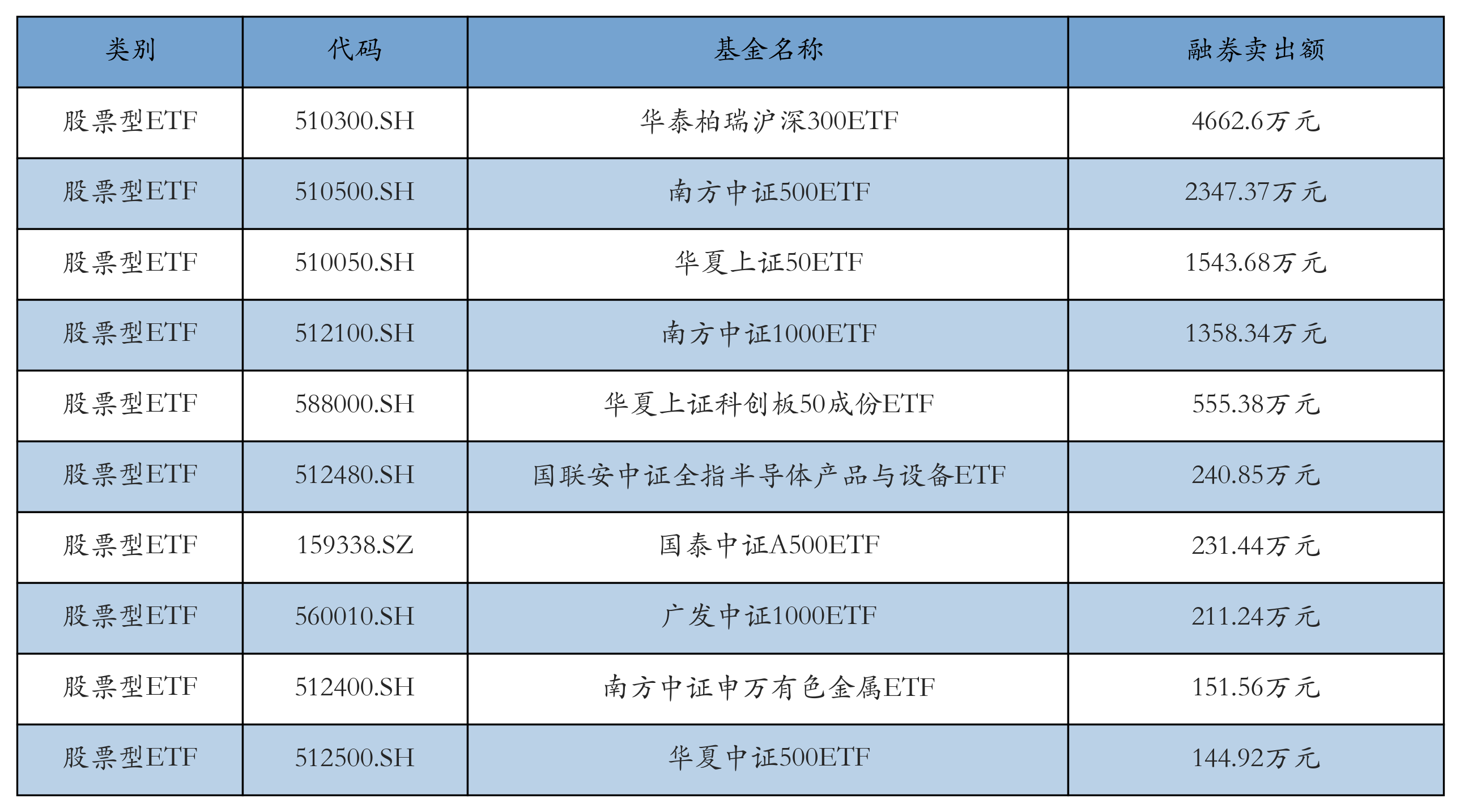 昨日股票型ETF融資賣(mài)出額最高的3只ETF及其賣(mài)出金額分別為:華泰柏瑞滬深300ETF(4662.6萬(wàn)元)、南方中證500ETF(2347.37萬(wàn)元)、華夏上證50ETF(1543.68萬(wàn)元)。融券賣(mài)出額前10詳情見(jiàn)下表: