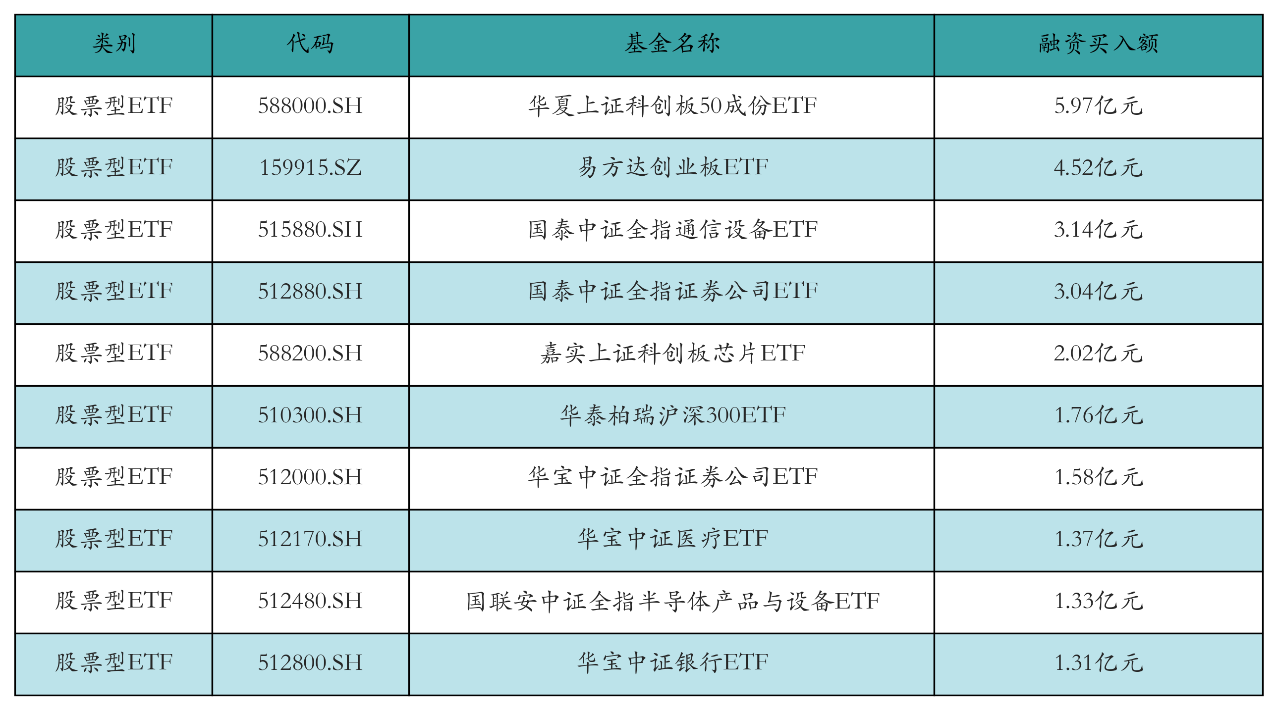 昨日股票型ETF融資買(mǎi)入額最高的3只ETF及其買(mǎi)入金額分別為:華夏上證科創(chuàng)板50成份ETF(5.97億元)、易方達(dá)創(chuàng)業(yè)板ETF(4.52億元)、國(guó)泰中證全指通信設(shè)備ETF(3.14億元)。融資買(mǎi)入額前10詳情見(jiàn)下表: