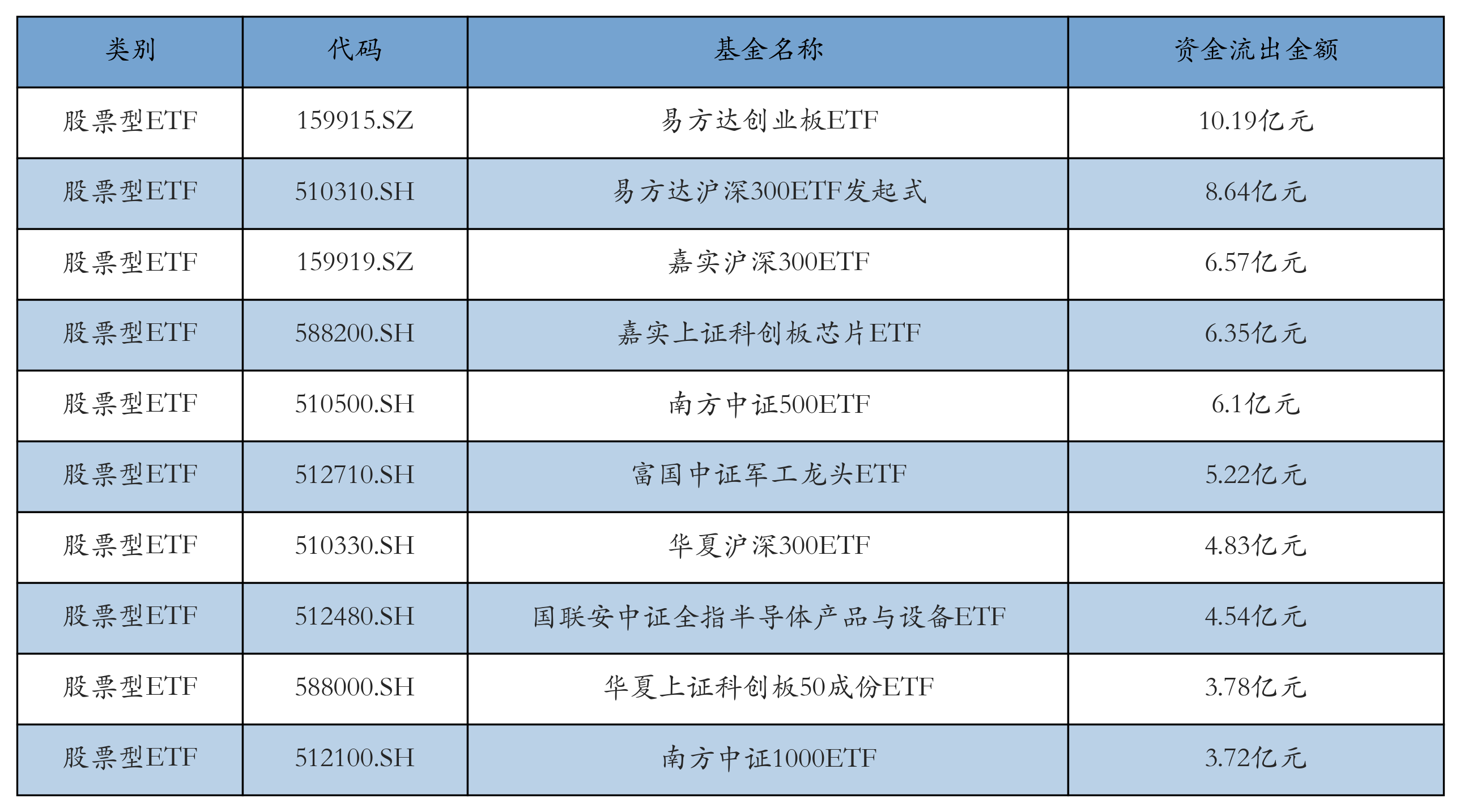 昨日股票型ETF資金流出最多的3只ETF及其流出金額分別為:易方達(dá)創(chuàng)業(yè)板ETF(流出10.19億元)、易方達(dá)滬深300ETF發(fā)起式(流出8.64億元)、嘉實(shí)滬深300ETF(流出6.57億元)。資金流出前10詳情見(jiàn)下表: