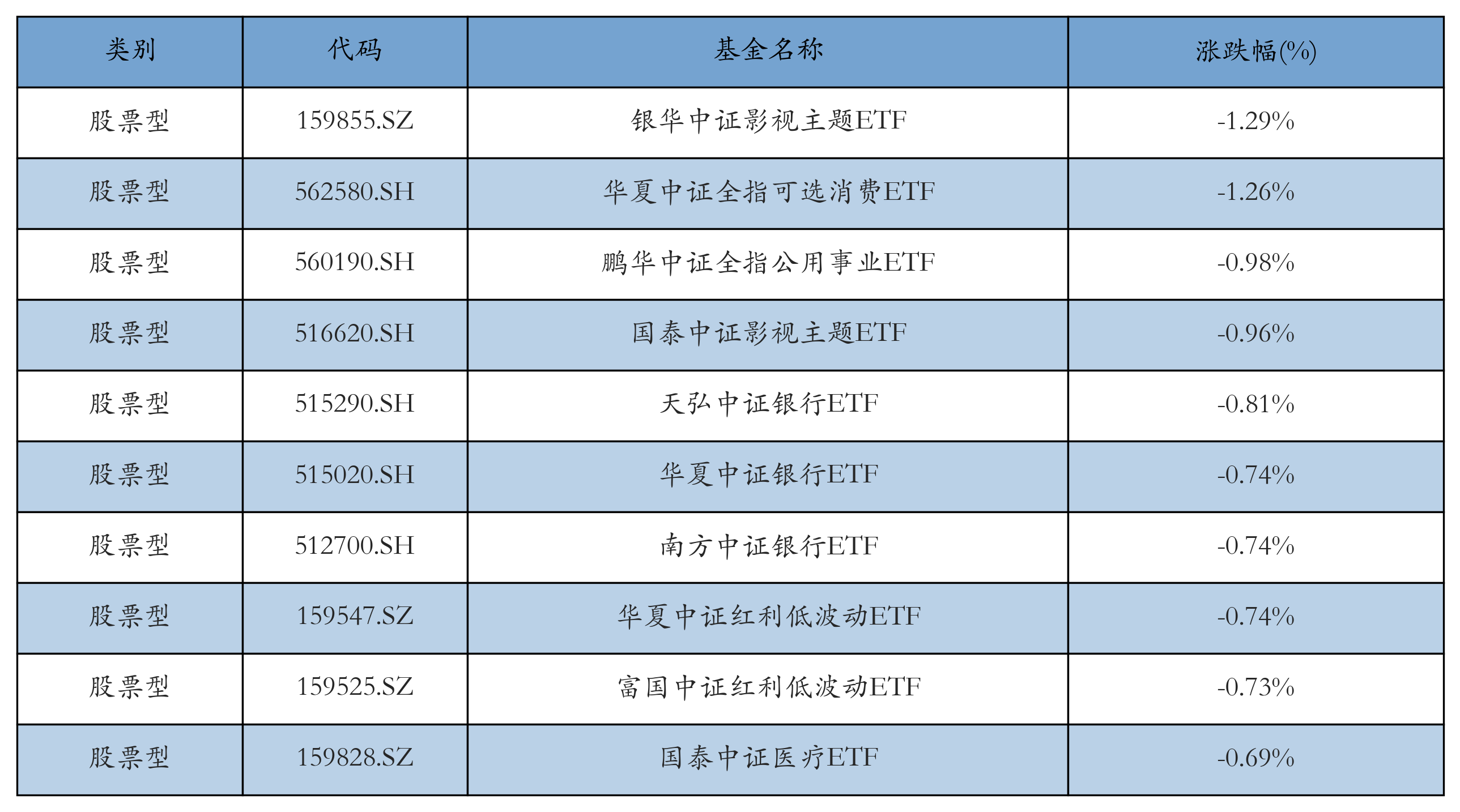 昨日股票型ETF跌幅最大的3只ETF及其收益率分別為:銀華中證影視主題ETF(-1.29%)、華夏中證全指可選消費(fèi)ETF(-1.26%)、鵬華中證全指公用事業(yè)ETF(-0.98%)。跌幅前10詳情見(jiàn)下表: