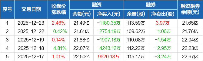 中銀證券融資融券信息顯示,2025年12月23日融資凈償還1180.35萬(wàn)元;融資余額21.49億元,較前一日下降0.55%。