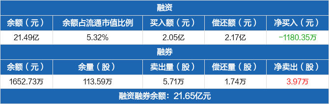 融資方面,當(dāng)日融資買入2.05億元,融資償還2.17億元,融資凈償還1180.35萬(wàn)元,連續(xù)4日凈償還累計(jì)1.01億元。融券方面,融券賣出5.71萬(wàn)股,融券償還1.74萬(wàn)股,融券余量113.59萬(wàn)股,融券余額1652.73萬(wàn)元。融資融券余額合計(jì)21.65億元。
