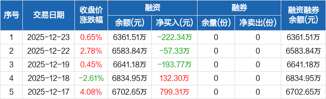 融資方面,當日融資買入627.42萬元,融資償還849.76萬元,融資凈償還222.34萬元,連續(xù)3日凈償還累計473.44萬元。融券方面,融券賣出0份,融券償還0份,融券余量0份,融券余額0元。融資融券余額合計6361.51萬元。