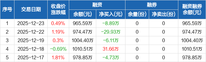 融資方面,當日融資買入2668元,融資償還9.15萬元,融資凈償還8.89萬元,連續(xù)3日凈償還累計44.92萬元。融券方面,融券賣出0份,融券償還0份,融券余量0份,融券余額0元。融資融券余額合計965.59萬元。