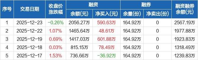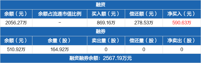 融資方面,當日融資買入869.16萬元,融資償還278.53萬元,融資凈買入590.63萬元,連續(xù)4日凈買入累計1319.61萬元。融券方面,融券賣出0份,融券償還0份,融券余量164.92萬份,融券余額510.92萬元。融資融券余額合計2567.19萬元。