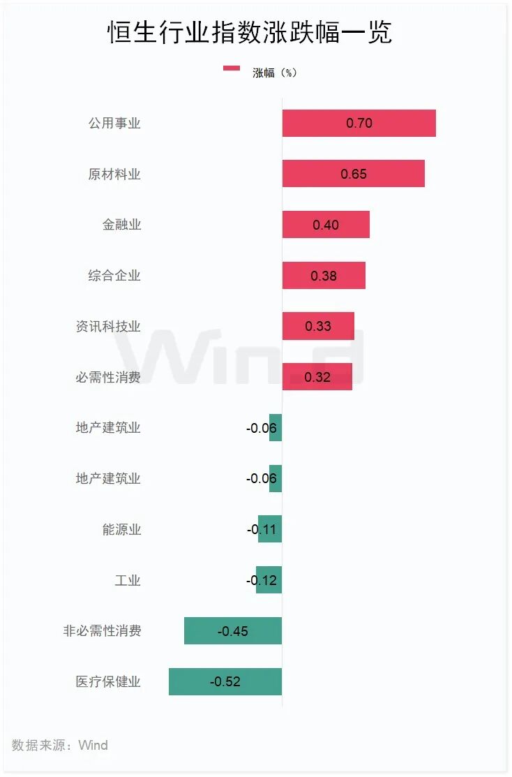 從行業(yè)表現(xiàn)看,恒生行業(yè)指數(shù)日內(nèi)漲跌不一,公用事業(yè)指數(shù)漲0.7%,原材料業(yè)指數(shù)漲0.65%,金融業(yè)指數(shù)漲0.4%。跌幅方面,醫(yī)療保健業(yè)指數(shù)跌0.52%,非必需性消費行業(yè)指數(shù)跌0.45%,工業(yè)指數(shù)跌0.12%。