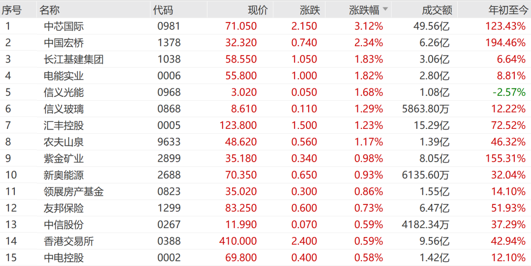 中芯國際漲3.21%,中國宏橋漲2.34%,長江基建集團漲1.83%,領(lǐng)漲藍籌。