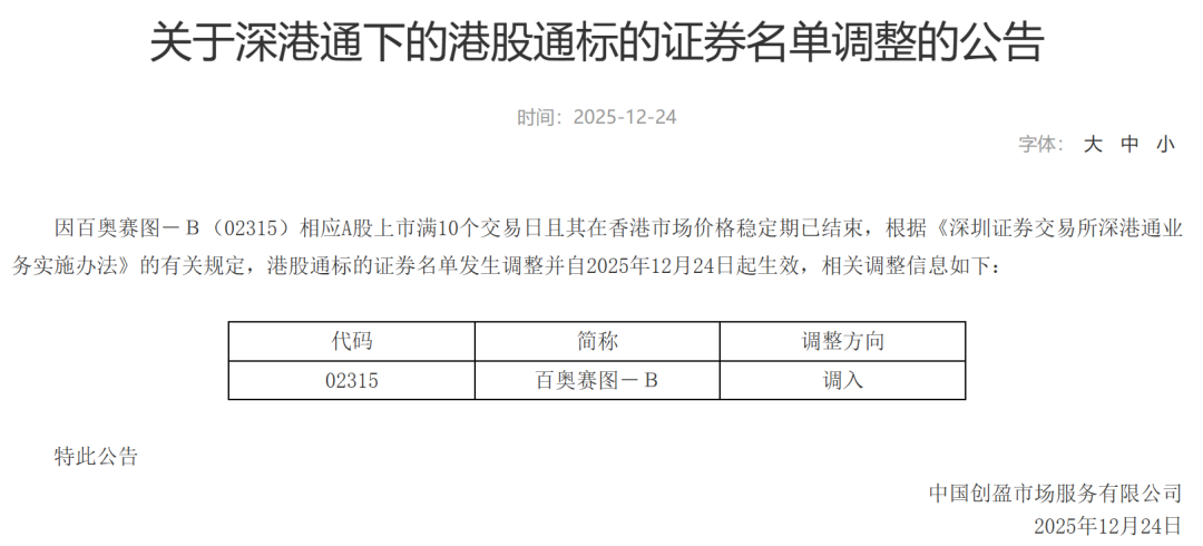 12月24日,深交所發(fā)布公告稱,因百奧賽圖-B在香港市場價格穩(wěn)定期結(jié)束且相應(yīng)A股上市滿10個交易日,根據(jù)有關(guān)規(guī)定,港股通標(biāo)的證券名單發(fā)生調(diào)整,自2025年12月24日起生效,調(diào)入百奧賽圖。