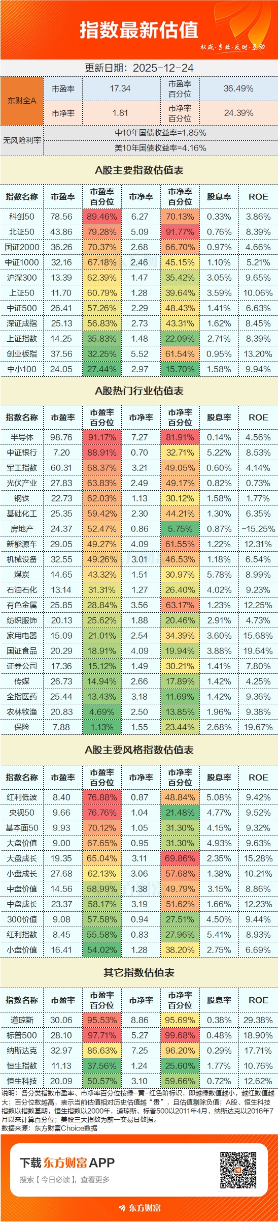 截至12月24日收盤,東方財富Choice數(shù)據(jù)顯示,東財全A市盈率為17.34倍,市盈率百分位為36.49%;市凈率為1.81倍,市凈率百分位為24.39%。