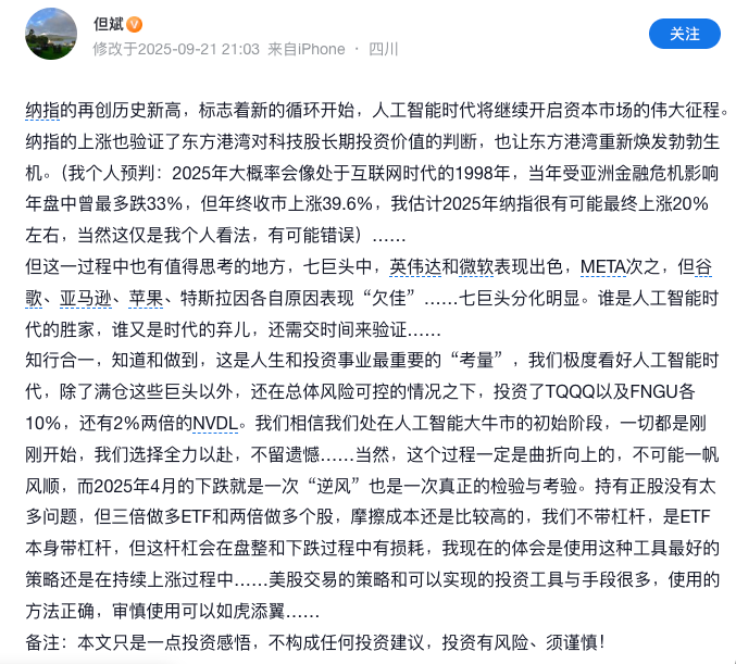 今年9月但斌曾發(fā)文預(yù)判,“2025年大概率會像處于互聯(lián)網(wǎng)時代的1998年”,并估計納指最終可能上漲20%左右。他透露自己“看好人工智能時代”,除了滿倉美股科技巨頭之外,還配置了ETF工具,選擇“全力以赴,不留遺憾”。