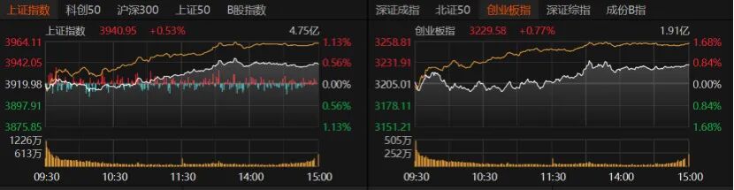 今日早盤(pán)指數(shù)窄幅震蕩,午后震蕩走高。最終滬指收漲0.53%報(bào)3940.95點(diǎn),創(chuàng)業(yè)板指收漲0.77%報(bào)3229.58點(diǎn),深證成指收漲0.88%??苿?chuàng)50、滬深300、北證50微漲,上證50微跌。