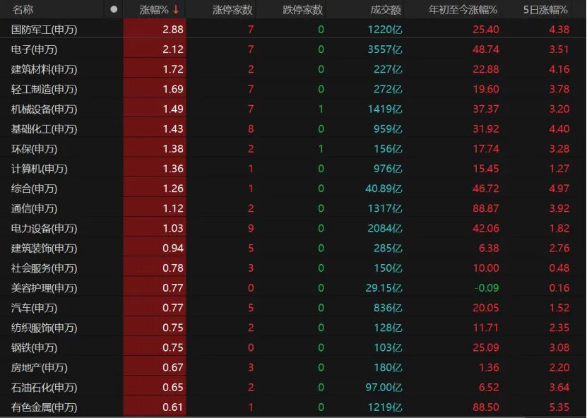 31個(gè)申萬(wàn)一級(jí)行業(yè)板塊中,農(nóng)林牧漁、煤炭、食品飲料、銀行板塊微跌,其余均收紅。國(guó)防軍工、電子、建筑材料、輕工制造、機(jī)械設(shè)備、基礎(chǔ)化工、環(huán)保、計(jì)算機(jī)、通信、電力設(shè)備等板塊漲幅均超過(guò)1%。