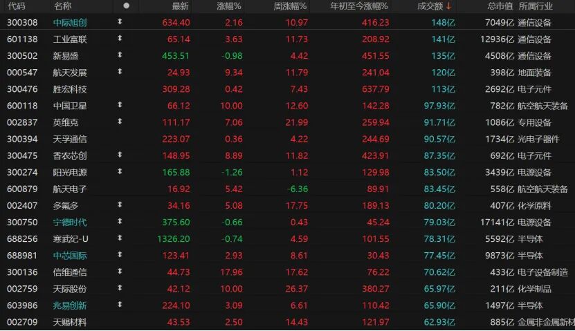 市場(chǎng)賺錢(qián)效應(yīng)不錯(cuò),4128只個(gè)股收漲,漲停股86只;1137只個(gè)股收跌,跌停股6只。僅5只個(gè)股日成交額超過(guò)100億元,中際旭創(chuàng)收漲2.16%報(bào)634.4元/股,工業(yè)富聯(lián)收漲3.63%報(bào)65.14元/股,新易盛微跌0.98%,航天發(fā)展漲逾9%,勝宏科技微漲。