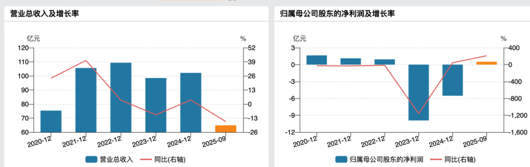 業(yè)績方面,2025年前三季度,公司實現(xiàn)營業(yè)總收入64.89億元,同比下降16.20%;歸母凈利潤為5092.02萬元,同比扭虧。