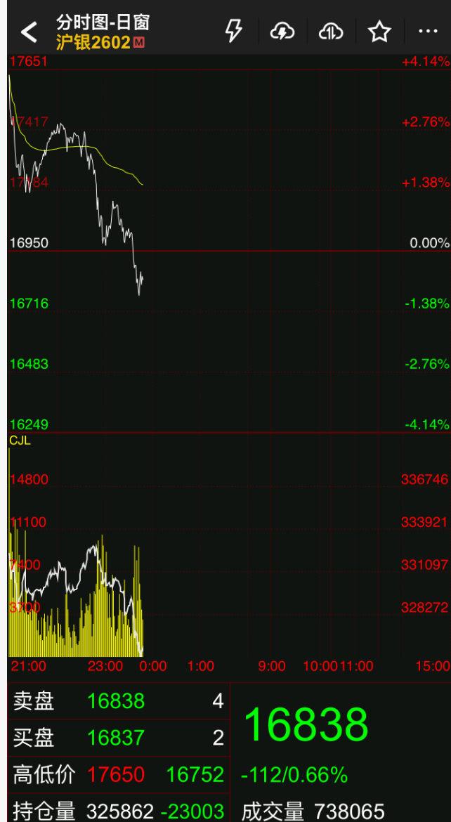 國內(nèi)方面,滬銀主力合約轉(zhuǎn)跌,現(xiàn)報16926元/千克,此前一度漲超4%。