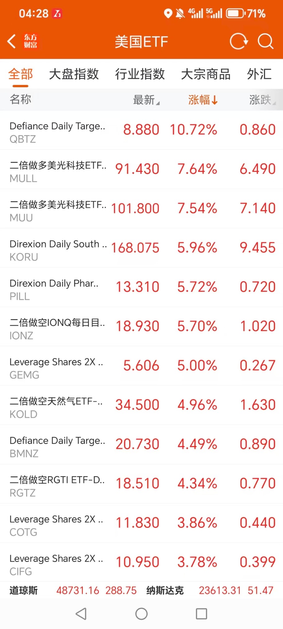 三倍做多納指ETF-ProShares(TQQQ.US) 升0.79%,成交額13.88億美元。