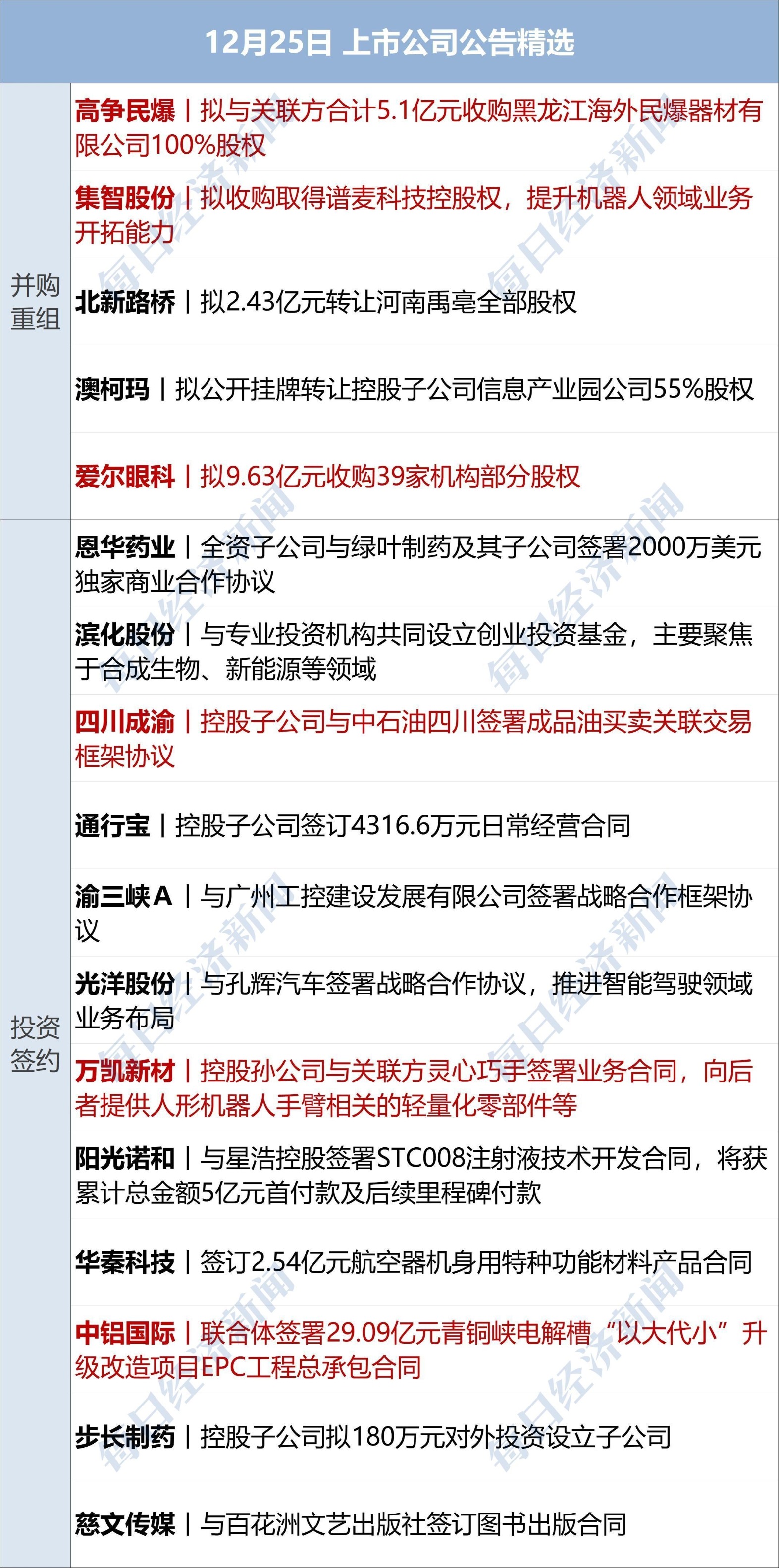 優(yōu)必選(HK09880,股價(jià)109.50港元,市值551.22億港元)、鋒龍股份(SZ002931,股價(jià)19.68元,市值43.00億元):24日,優(yōu)必選發(fā)布公告,擬以“協(xié)議轉(zhuǎn)讓+要約收購”的組合方式共收購深交所上市公司鋒龍股份93957518股(占鋒龍股份公司股份總數(shù)43%)。根據(jù)公告,本次控制權(quán)變更方案中的股份轉(zhuǎn)讓價(jià)格、要約收購價(jià)格均為17.72元/股(相比12月17日鋒龍股份停牌前的19.68元/股折讓10%),以此計(jì)算,合計(jì)總對價(jià)達(dá)16.65億元。本次交易完成后,上市公司控股股東將由誠鋒投資變更為優(yōu)必選,實(shí)際控制人電董劍剛變更為周劍。公司股票自2025年12月25日開市起復(fù)牌。