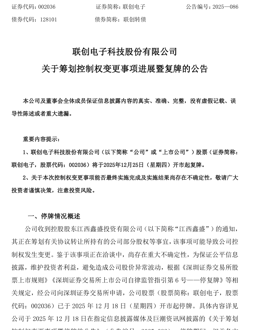 【周四復(fù)牌!002036 地方國資擬入主】12月24日晚,在停牌籌劃控制權(quán)變更事項(xiàng)5個(gè)交易日后,聯(lián)創(chuàng)電子(002036)披露了最新進(jìn)展。