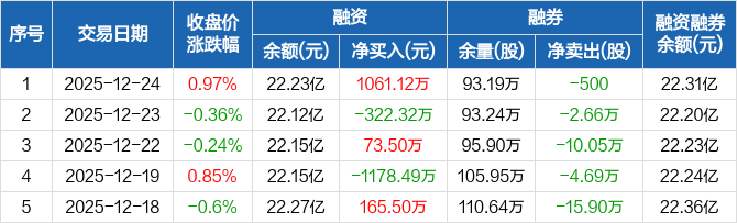 國元證券融資融券信息顯示,2025年12月24日融資凈買入1061.12萬元;融資余額22.23億元,較前一日增加0.48%