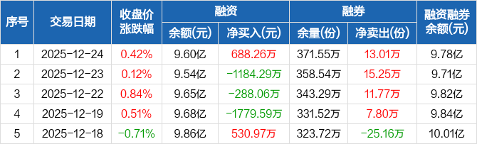 融資方面,當(dāng)日融資買入1385.37萬元,融資償還697.1萬元,融資凈買入688.26萬元。融券方面,融券賣出25.43萬份,融券償還12.42萬份,融券余量371.55萬份,融券余額1795.34萬元。融資融券余額合計9.78億元。