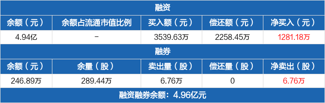 融資方面,當日融資買入3539.63萬元,融資償還2258.45萬元,融資凈買入1281.18萬元,連續(xù)3日凈買入累計2905.68萬元。融券方面,融券賣出6.76萬份,融券償還0份,融券余量289.44萬份,融券余額246.89萬元。融資融券余額合計4.96億元。