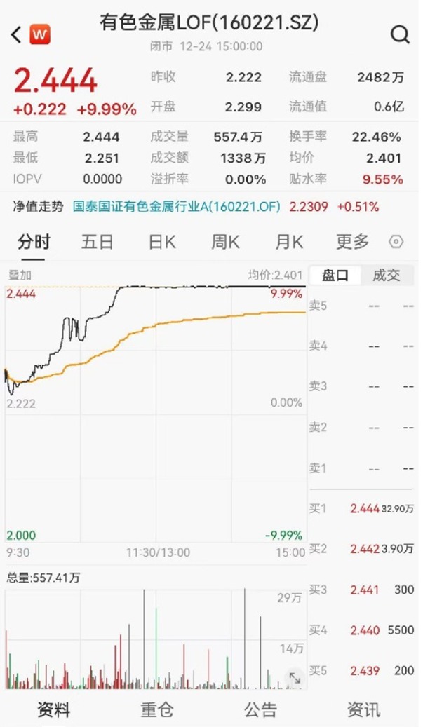 白銀基金引發(fā)場內(nèi)LOF狂歡。12月24日白銀LOF繼續(xù)漲停,溢價已經(jīng)高達接近70%,利用LOF場內(nèi)交易價格與凈值的價差進行套利的方法引發(fā)市場關注。由于該LOF場內(nèi)價格相較場外凈值有高溢價,故若在T日證券賬戶內(nèi)選擇“場內(nèi)申購”(非直接買入)按凈值申購,投資者可以在T+2日份額到賬后,以場內(nèi)高價賣出,賺取一定差價。高溢價漲停帶來資金溢出效應,場內(nèi)多只商品LOF產(chǎn)品漲停,有色金屬LOF(160221)開盤后一路走高并漲停。但我們也提醒投資者,套利并不是穩(wěn)賺不賠,背后也存在一定風險,還是要做好風險管理,謹慎參與。