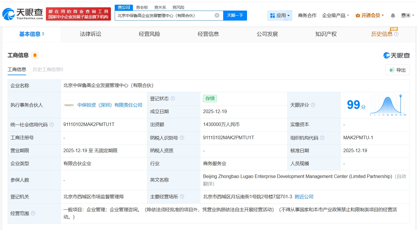 南方財經(jīng)12月25日電,天眼查App顯示,近日,北京中保魯高企業(yè)發(fā)展管理中心(有限合伙)成立,執(zhí)行事務(wù)合伙人為中保投資(深圳)有限責(zé)任公司,出資額143億人民幣,經(jīng)營范圍為企業(yè)管理、企業(yè)管理咨詢,由中國保險投資基金(有限合伙)、山東省農(nóng)村經(jīng)濟(jì)開發(fā)投資有限公司、中保投資(深圳)有限責(zé)任公司共同出資。