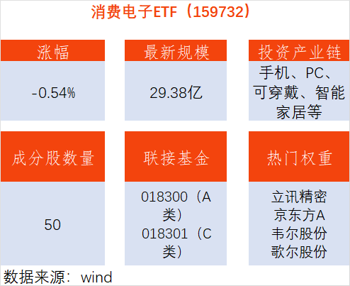 消費(fèi)電子ETF(159732)跟蹤國證消費(fèi)電子指數(shù),主要投資于業(yè)務(wù)涉及消費(fèi)電子產(chǎn)業(yè)的50家A股上市公司,行業(yè)主要分布于電子制造、半導(dǎo)體、光學(xué)光電子等市場關(guān)注度較高的主流板塊。其場外聯(lián)接基金為,A類:018300;C類:018301。