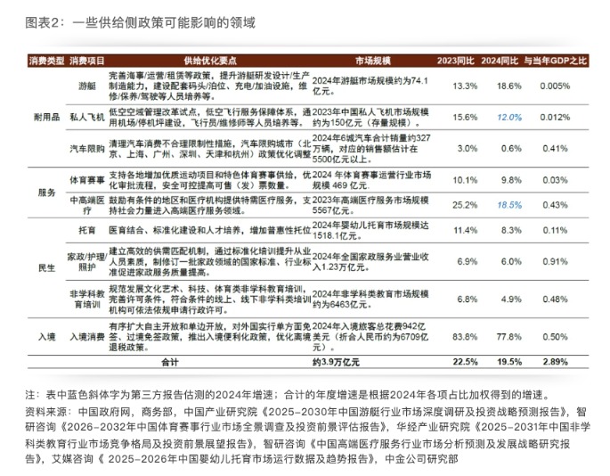 供給側(cè)促消費旨在理順體制機制、增強配套建設(shè),釋放消費潛力。增加優(yōu)質(zhì)消費供給立足長遠(yuǎn),供給側(cè)要做好相關(guān)產(chǎn)業(yè)的長期培育和鼓勵發(fā)展,并非一蹴而就。我們梳理了一些代表性的供給側(cè)可以做調(diào)整的消費領(lǐng)域,包括汽車(限購的城市)、游艇、私人飛機等耐用品,體育賽事、中高端醫(yī)療等服務(wù)消費,托育、家政(包含護理、照護)、(非學(xué)科)教培等民生消費,以及入境消費。