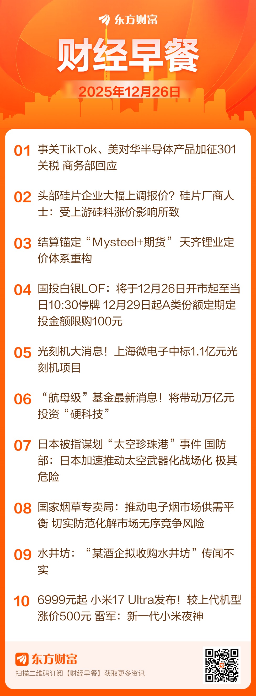 東方財(cái)富財(cái)經(jīng)早餐 12月26日周五