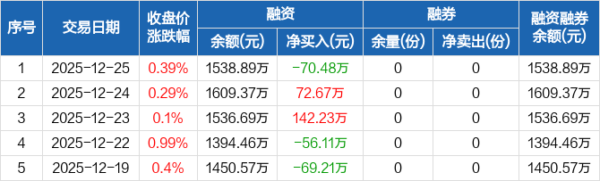 融資方面,當(dāng)日融資買(mǎi)入192.82萬(wàn)元,融資償還263.3萬(wàn)元,融資凈償還70.48萬(wàn)元。融券方面,融券賣(mài)出0份,融券償還0份,融券余量0份,融券余額0元。融資融券余額合計(jì)1538.89萬(wàn)元。