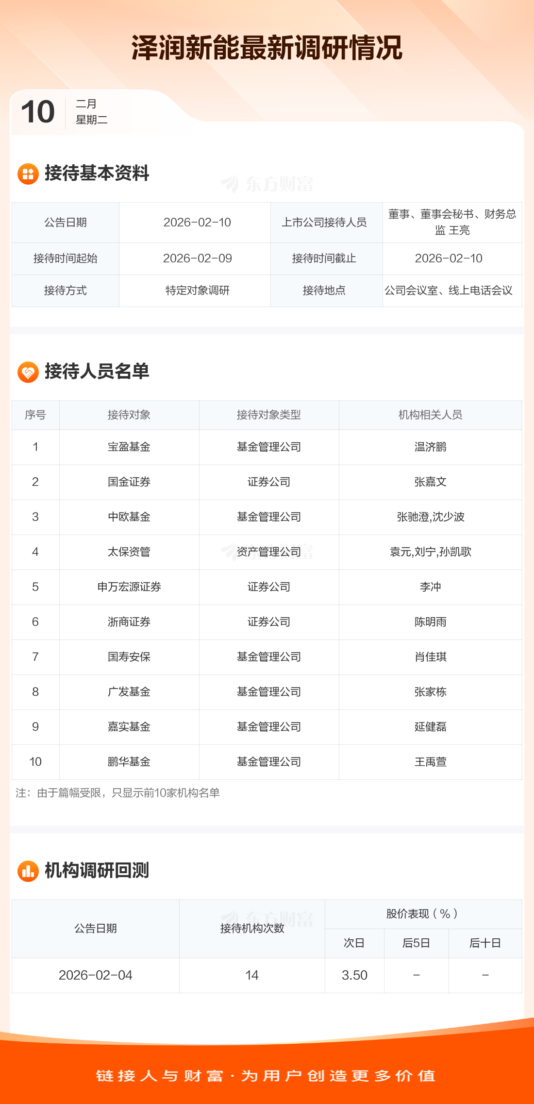 澤潤(rùn)新能2月10日公告稱,2月9日至2月10日接待寶盈基金等14家機(jī)構(gòu)調(diào)研。接待人員包括董事、董事會(huì)秘書、財(cái)務(wù)總監(jiān) 王亮。