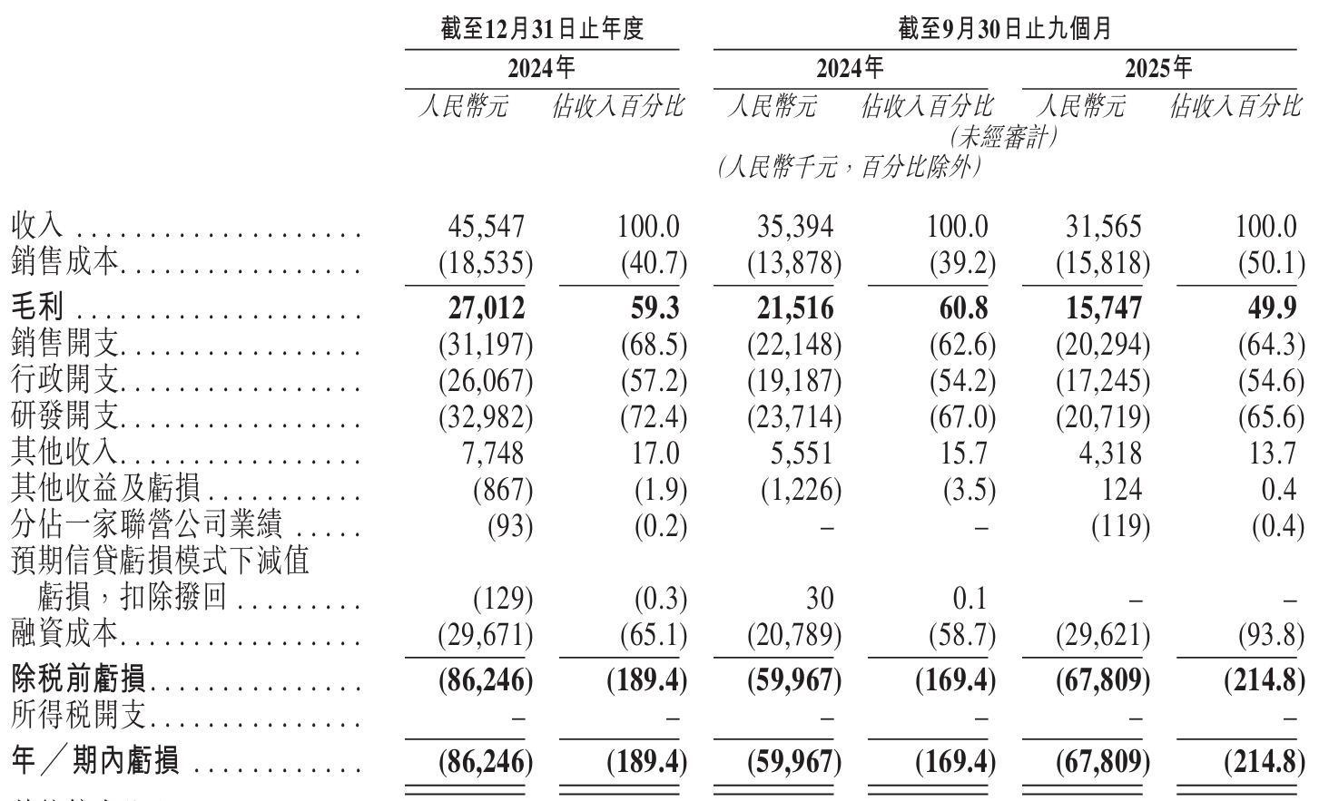 2025年前九個月,公司銷售成本占收入比從上一年度的40.7%攀升至50.1%。在核心產(chǎn)品銷售占比超50%的情況下,成本控制能力的波動無疑增加了投資者對其商業(yè)化路徑可持續(xù)性的疑慮。