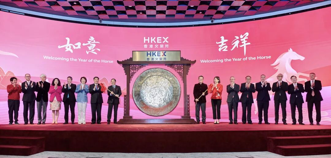 2月20日,港交所在香港金融大會堂舉行新春開市儀式,香港財政司司長陳茂波與港交所主席唐家成一同敲響新一年開市鐘聲,正式開啟馬年港股交易。