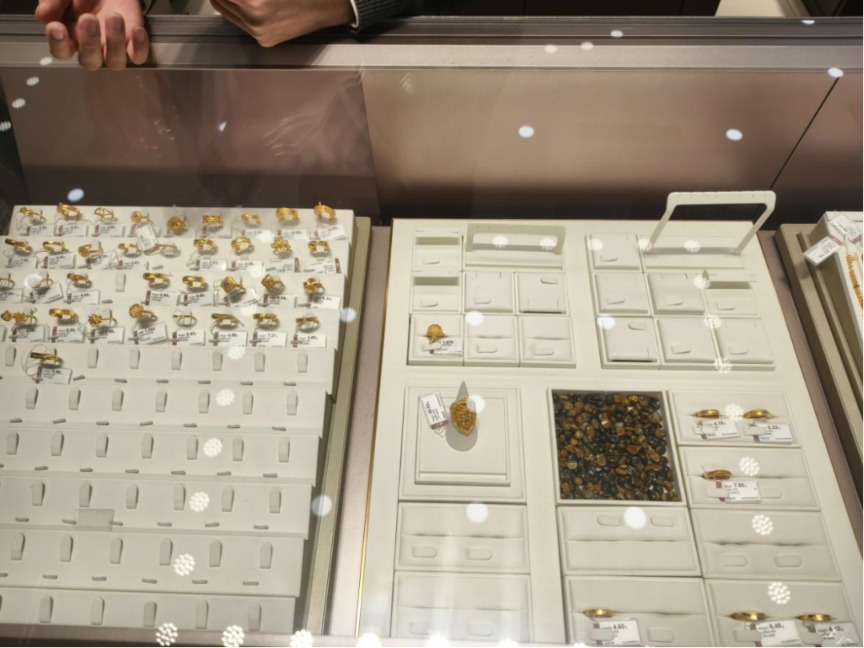在周大福、六福珠寶等門(mén)店內(nèi),多個(gè)黃金首飾柜臺(tái)被圍得水泄不通。記者在六福珠寶門(mén)店內(nèi)看到,黃金戒指等產(chǎn)品的展示區(qū)域已經(jīng)清空大半?!斑@些都賣完了,沒(méi)貨擺了?!绷V閷毜陜?nèi)工作人員一邊整理著剩余樣品,一邊對(duì)記者說(shuō)。