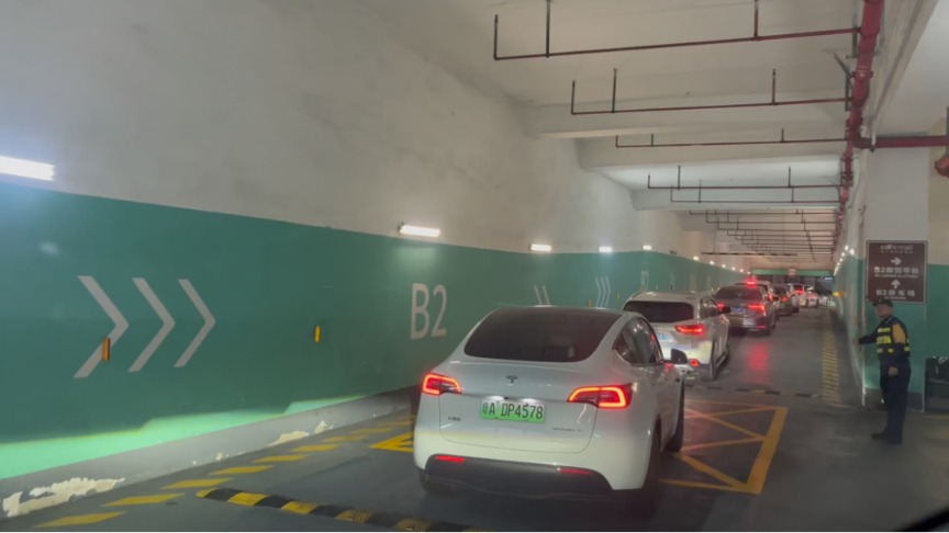同一時(shí)間,位于??谛潞8鄣腸df??趪?guó)際免稅城車庫(kù)入口處已排起百米長(zhǎng)隊(duì),車輛在工作人員的引導(dǎo)下依次駛?cè)胲噹?kù)。