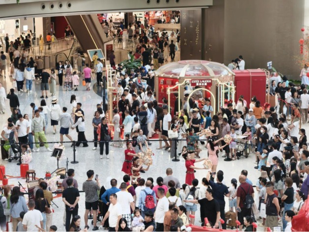 cdf三亞國(guó)際免稅城內(nèi),市民游客在觀看舞蹈表演。記者黎靈希攝