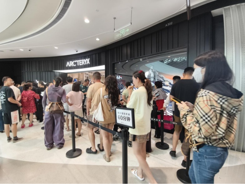 今年,進(jìn)口腕表等區(qū)域人氣有所回落,而戶外運(yùn)動(dòng)服飾則異軍突起,備受青睞。始祖鳥(niǎo)門(mén)店內(nèi),眾多游客忙著試穿與三亞氣溫明顯不符的熱門(mén)款沖鋒衣;店外,等待進(jìn)店的消費(fèi)者排起長(zhǎng)隊(duì),隊(duì)尾旁邊設(shè)置著“預(yù)計(jì)排隊(duì)時(shí)間60分鐘”的提示牌。