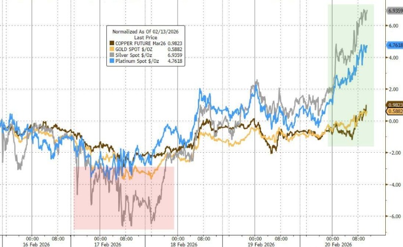 華爾街見聞提及,最高法裁決后特朗普動用替補工具,加征10%全球關稅,放話關稅會比之前“高得多”。政策混亂疊加疲軟美元趨勢,周五黃金漲超2%、重回5100美元?,F(xiàn)貨白銀大漲8%。