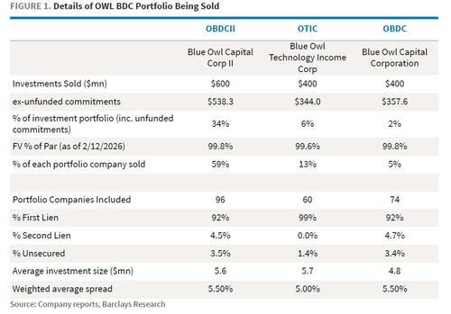 Blue Owl本周的一系列動作凸顯其面臨的多重壓力。該公司宣布出售14億美元貸款資產(chǎn),其中OBDC II出售6億美元(占其總投資承諾的34%),OTIC出售4億美元(占6%),另一只公開交易的Blue Owl Capital Corp(OBDC)出售4億美元(占2%)。