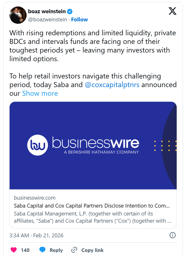 Weinstein在社交媒體平臺X上表示,此舉旨在"幫助散戶投資者度過這一充滿挑戰(zhàn)的時期"。他指出,隨著贖回請求上升和流動性受限,私募BDC和區(qū)間基金正面臨最艱難時期之一,許多投資者選擇有限。